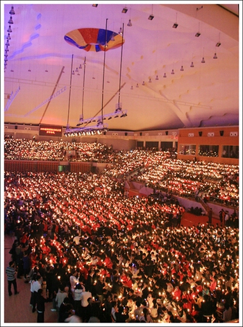 3、台上有全院师生组成的合唱团,当全体新生的蜡烛都被点燃后,合唱团开始合唱。全体师生随着音乐轻轻摆动蜡烛并逐渐加入合唱。