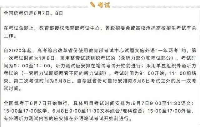 全国统考时间仍安排在6月7日、8日。根据《规定》,今年高考,高级中等教育学校非应届毕业的在校生等五类人员禁止报考,全国高考加分项目也确定(对抗击疫情医护人员子女暂未定)。