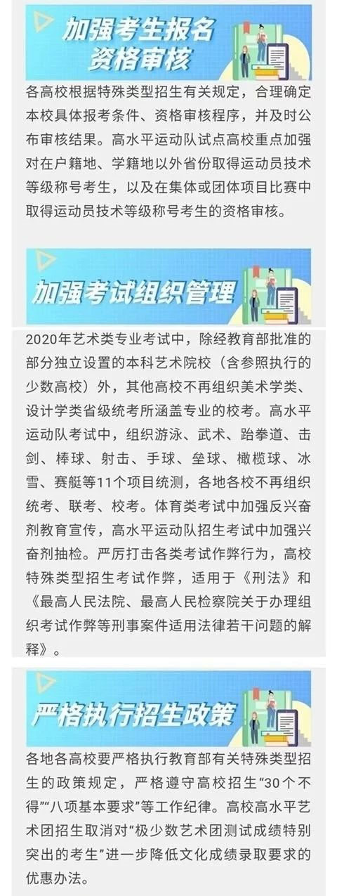 教育部公布《2020年普通高等学校招生工作规定》,以及各高校根据特殊类型招生有关规定,合理确定本校具体报考条件、资格审核程序,并及时公布审核结果。高水平运动队试点高校重点加强对在户籍地、学籍地以外省份取得运动员技术等级称号考生,以及在集体或团体项目比赛中取得运动员技术等级称号考生的资格审核。