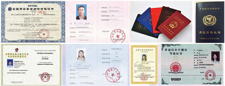 技能证书:民航礼仪资格证书、普通话等级认证、计算机、商务英语等级证书、职业资格证书等。